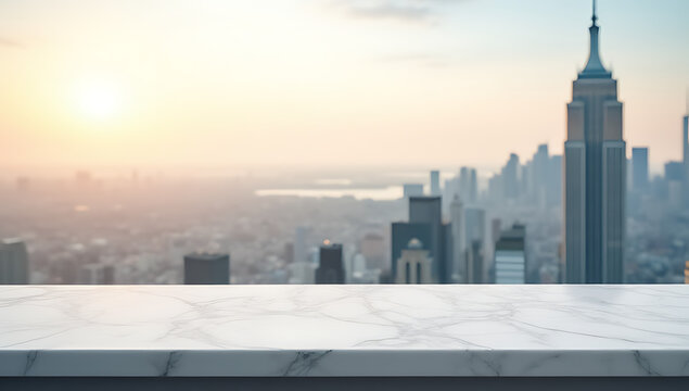 Marble countertop in the foreground features a serene cityscape as a background for creative presentations and design mockup ideas._00002_