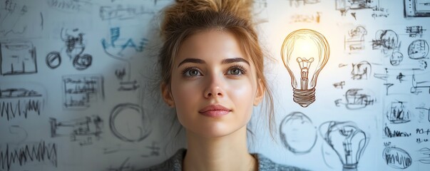 Female business professional looking at lightbulb symbol, surrounded by business sketches, creative thinking, digital strategy