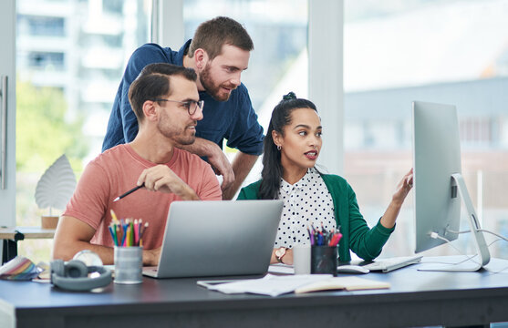 Meeting, computer and business people in creative office for planning, feedback or review for website development. Design team, technology and group in discussion for proposal with collaboration.
