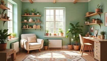 A modern loft cafe features a minimalist counter, artisanal items, hanging plants, and open shelving