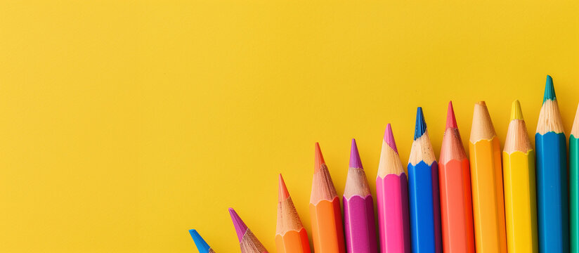Row of colorful pencils arranged diagonally on trendy yellow background with copy space for text