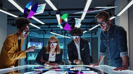 Innovative team collaborates using holograms in a modern workspace with futuristic vibes
