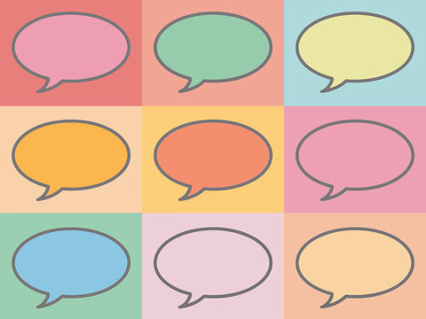 A grid of nine empty speech bubbles on a pastel-colored background represents communication and ideas, modern abstract concept for dialogue, messaging, brainstorming, and creative thinking design.