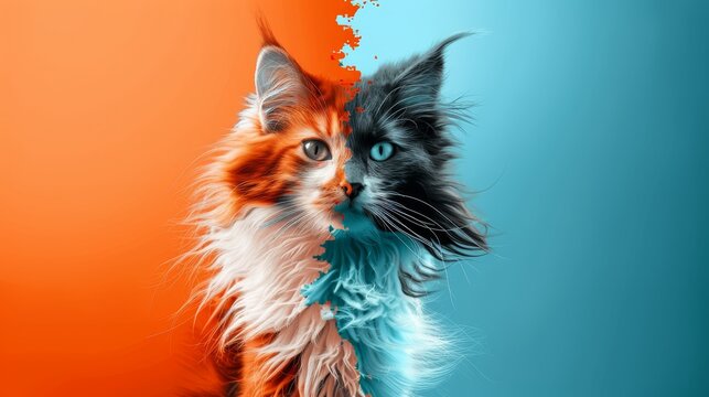 Dynamic half cat, half dog illustration, detailed and imaginative. Ideal for themes of hybrid creatures and artistic animal designs