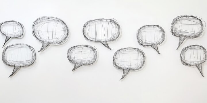 Opinions expressed through blank speech bubbles crafted from chrome wire, set against a neutral white background, showcase the concept of communication and dialogue. Shallow depth of field enhances