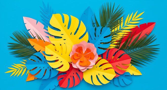 Pineapple with sunglasses and headphones sits on beach. Tropical summer vacation. Colorful flowers and fruits around it. Sunny day and turquoise sea. Relaxing summer vibe. Fun and creative image.