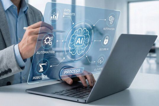 AI content generation for ads and marketing visuals in modern workspace, showing user creating text, code, and media using automation and creative tools for digital campaigns