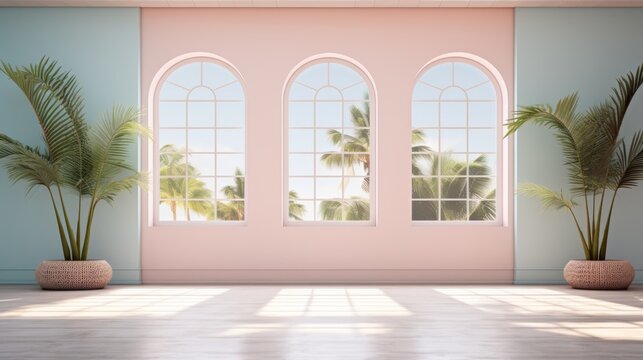 serene yoga studio with pastel-colored walls and tropical leaf accents, fostering a sense of peace and tranquility.