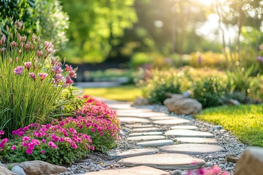 Transform outdoor spaces with vibrant flower beds and stone pathways in a sunlit garden landscape