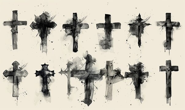 A captivating collection of hand-drawn crosses showcases an organic, raw quality, featuring rich brushstroke textures that evoke artistic expression and creativity