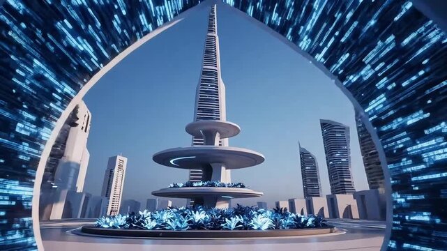 Futuristic architectural design with vibrant blue lights creates a modern, elegant, and captivating architectural showcase in the city skyline