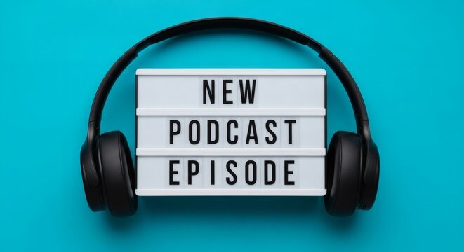 Podcast Launch Headphones frame light box announcing new episode on blue.