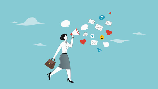 digital marketing, create promotional content to increase sales, internet or online marketing, woman content creator use megaphone to introduce their products and get good feedback illustration