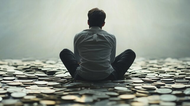 Person sitting on coins symbolizes financial reflection and credit counseling.