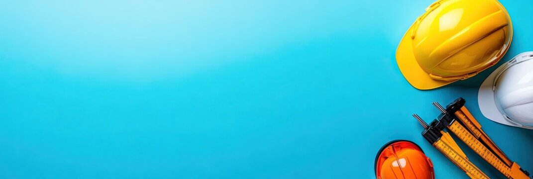 Labor Day in the USA. American flag. Protective helmet. Labor tools on a wooden background. Banner. created by AI