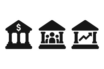 Financial institution solid icon set. Central bank, credit union, investment bank symbols. Finance, money, investment, stock market growth chart. Business vector illustration.