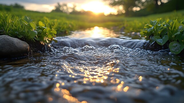 Cinematic 4K close anamorphic shot of stunning blue shimmering water flowing slowly along the side of a creek bed with vibrant green grass and leaves providing natural framing in the front