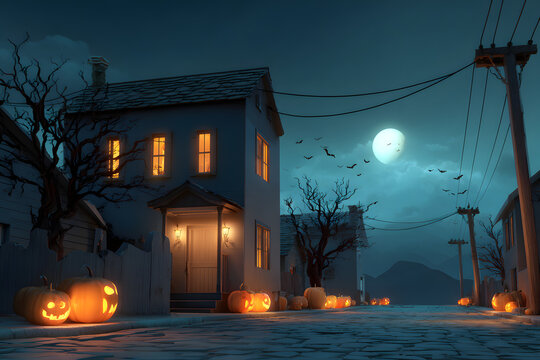 3D illustration of a Halloween concept background of realistic horror house and creepy street with moonlight.