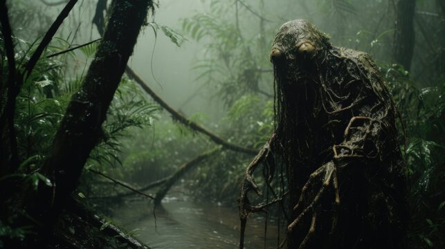 Enigmatic Shadows: Creepy Creature in the Rainy Jungle, Monsterous Ghost Alien Generative AI