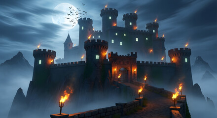 Mystical medieval castle shrouded in fog under a full moon with torches illuminating the entrance