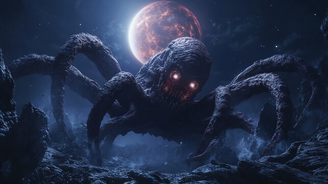 An alien creature with bioluminescent features, multiple eyes, and tentacles