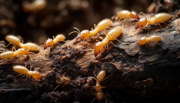 Macro close-up of pale orange termites crawling on decaying wood and soil, busy colony foraging with detailed textures and an unsettling industrious atmosphere