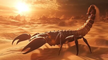 Scorpion on a sandy desert landscape during sunset