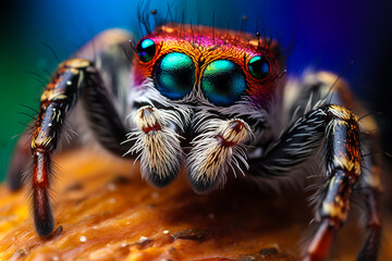 Generative AI illustration of macro closeup of jumping spider with bright eyes and long legs crawling on surface in nature