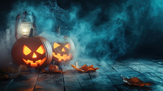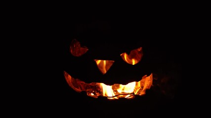 A creepy pumpkin with a carved grimace in the smoke. Jack o lantern in the dark.