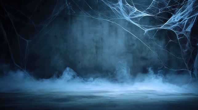 Haunted Room with Cobwebs and Mysterious Blue Fog