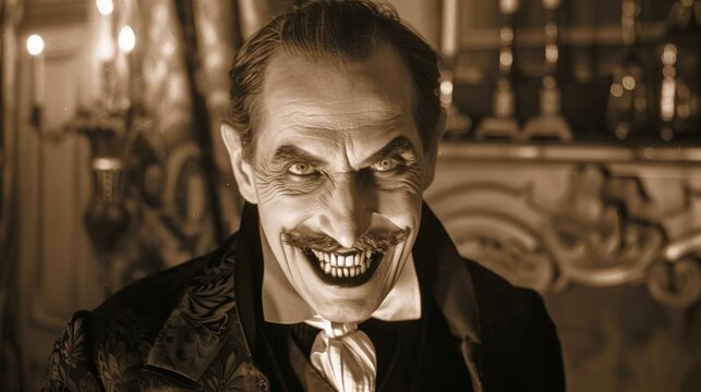 Portrait of crazy happy man with long hair, surfer male celebrating birthday, looking widely smiling, creepy halloween dark background.