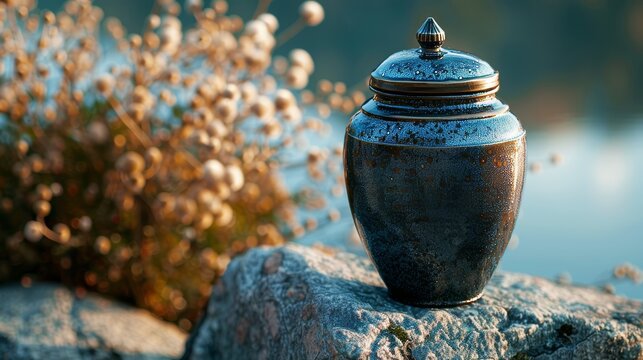 Peaceful and respectful close-up of a cremation urn for ashes, with a tranquil background to emphasize serenity and remembrance