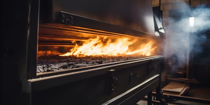 Crematorium, a coffin with a human body burns in the crematorium oven.