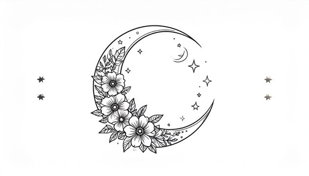 Floral crescent moon with stars illustration