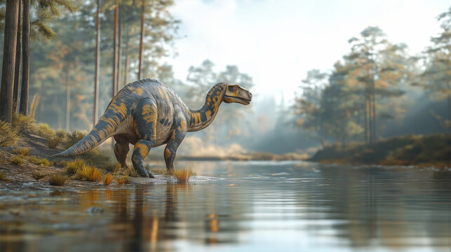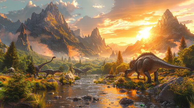 Prehistoric Jungle with Dinosaurs by a Tranquil River