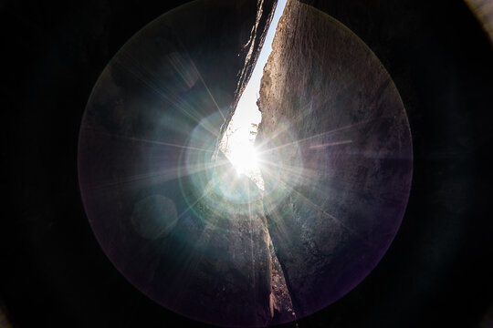 Dramatic sunburst shining through a narrow rock crevice, with visible light rays and lens flare creating a vibrant and dynamic effect.