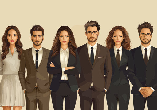 Successful Business Team of Six Professionals in Formal Attire, Cartoon Style Minimalistic Vector Illustration, Ideal for Teamwork and Corporate Collaboration Concepts