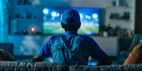 A youthful Indian cricket enthusiast watching a live match at home in their team jersey.