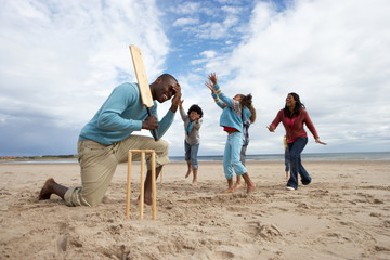 Family playing cricket on beach