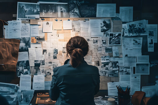 Detective stands in office considering investigation board. Photos, evidence organized on wall. Focused on solutions. Serious professional atmosphere. Investigating crime scene. Looking at evidence.