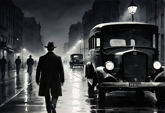 A somber, black-and-white film noir-inspired city street with rain and shadows
