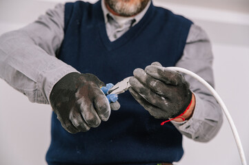 Close up, electrician using pliers to crimp terminals on wires. Wiring work, control cabinet, inverter system used to control electric motors