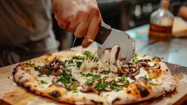 A pizza ter slicing through a crispy thin crust pizza topped with wild herbs mushrooms and melted mozzarella cheese.