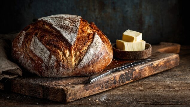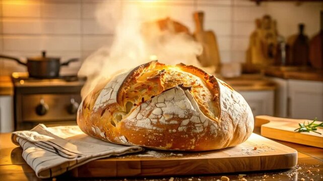 A freshly baked loaf of sourdough bread with a crispy crust. Featuring comfort and craftsmanship