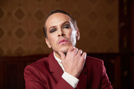 Portrait of attractive adult successful bald man art critic historian with beard in scarf in art gallery