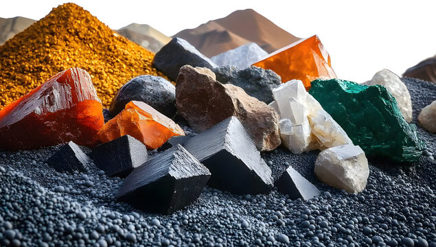Mixture of various critical minerals and raw materials essential for modern technology, including solar panels, semiconductors, wind turbines, batteries, and transportation. Mine and mining. Copy s...
