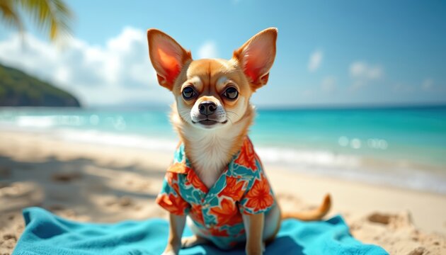 Small dog wearing Hawaiian shirt sits on blue towel at sunny beach. Ocean waves and sandy shore create summer vacation vibe. Adorable pet enjoys warm weather.