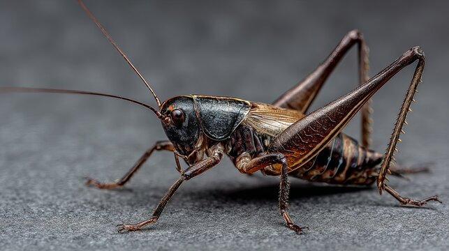 Close-up of a large, detailed grasshopper with intricate patterns on a dark background