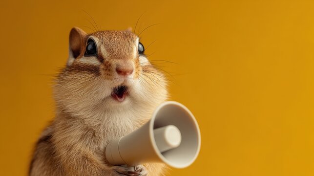 Chipmunk with megaphone against orange background expressing surprise.