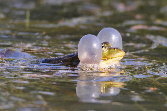 Green lake frog singing in water, frog, green, lake, singing, water, nature, wildlife, amphibian, vocal, croak